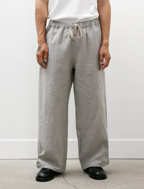 Oversized, wide leg pants cut from a lightweight linen plain weave in a warm light grey. Feature an elastic waistline with an outer drawstring, front on-seam pockets, and toggled elastic drawcords at the hems. The generous wide leg produces a high volume draped silhouette and can be cinched at the ankle for a balloon effect, complementing the bounce of the linen nicely. Constructed with low profile finishing techniques throughout for a minimal, smooth external surface.