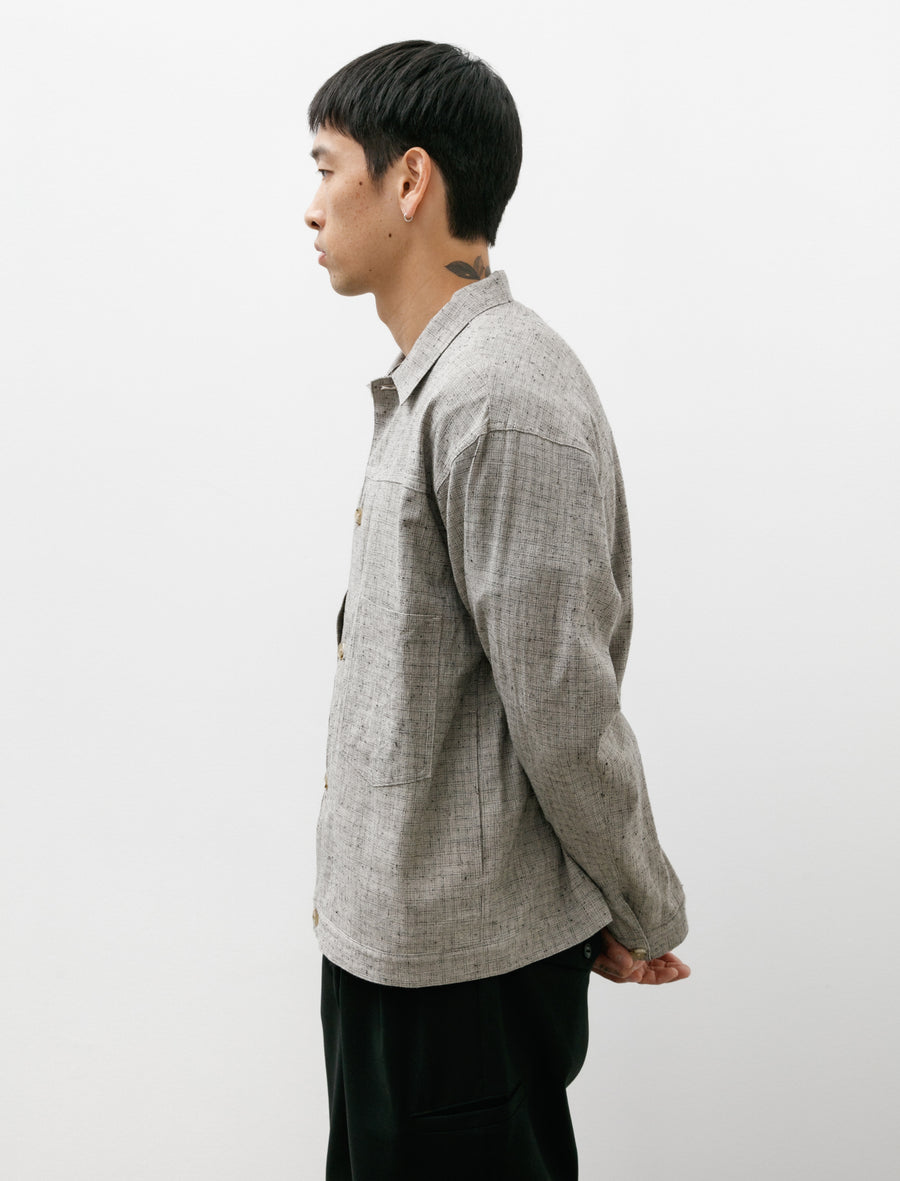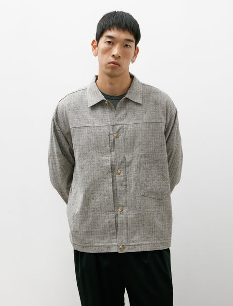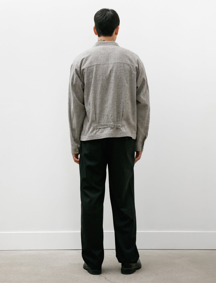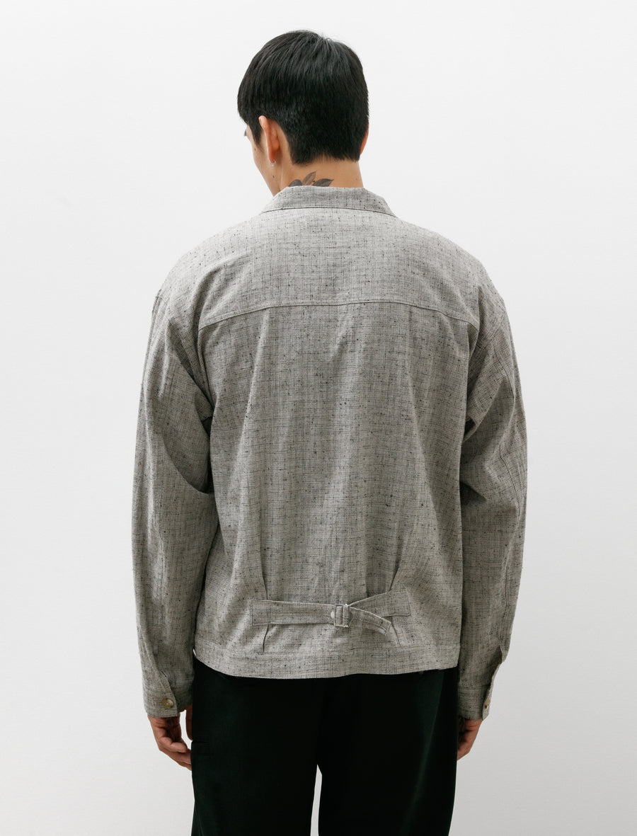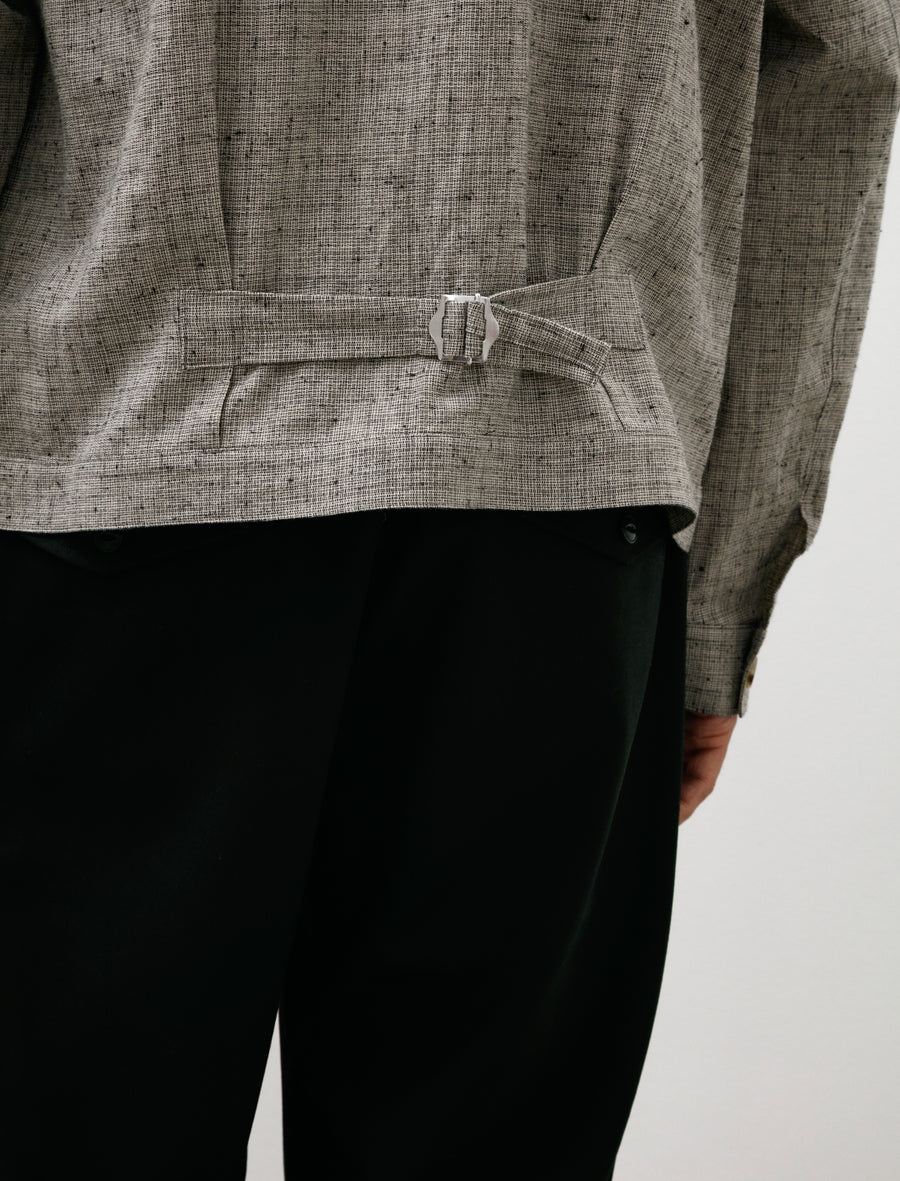 A relaxed fitting, cropped, button front jacket cut from a soft, slubby cotton/linen mirco-check in black on white with a basket-weave-like appearance. Features a classic collar, a pleated front with a concealed vertical zip pocket at the right side, on-seam hand pockets at the waist, a yoked shoulder, and a buckled waist cinch at the rear waist. Subtle tailoring throughout lends heightens the timeless silhouette while the texture and lightness of the cloth provides a sense of casual elegance; cinching the waist shifts volume to the back, producing a bloused effect. Constructed using single needle, flat felled seams throughout for a long lasting, encased finish; translucent horn buttons.