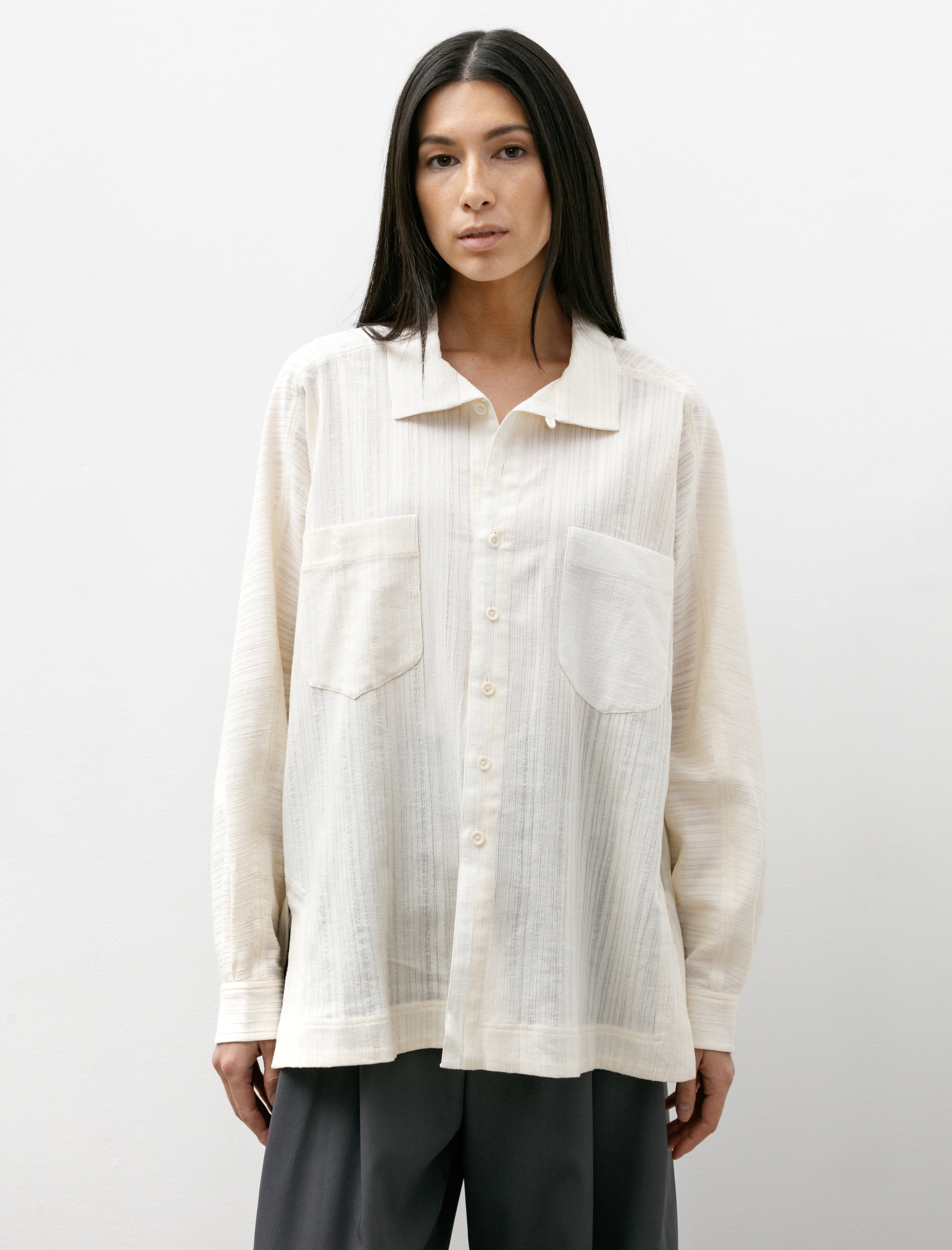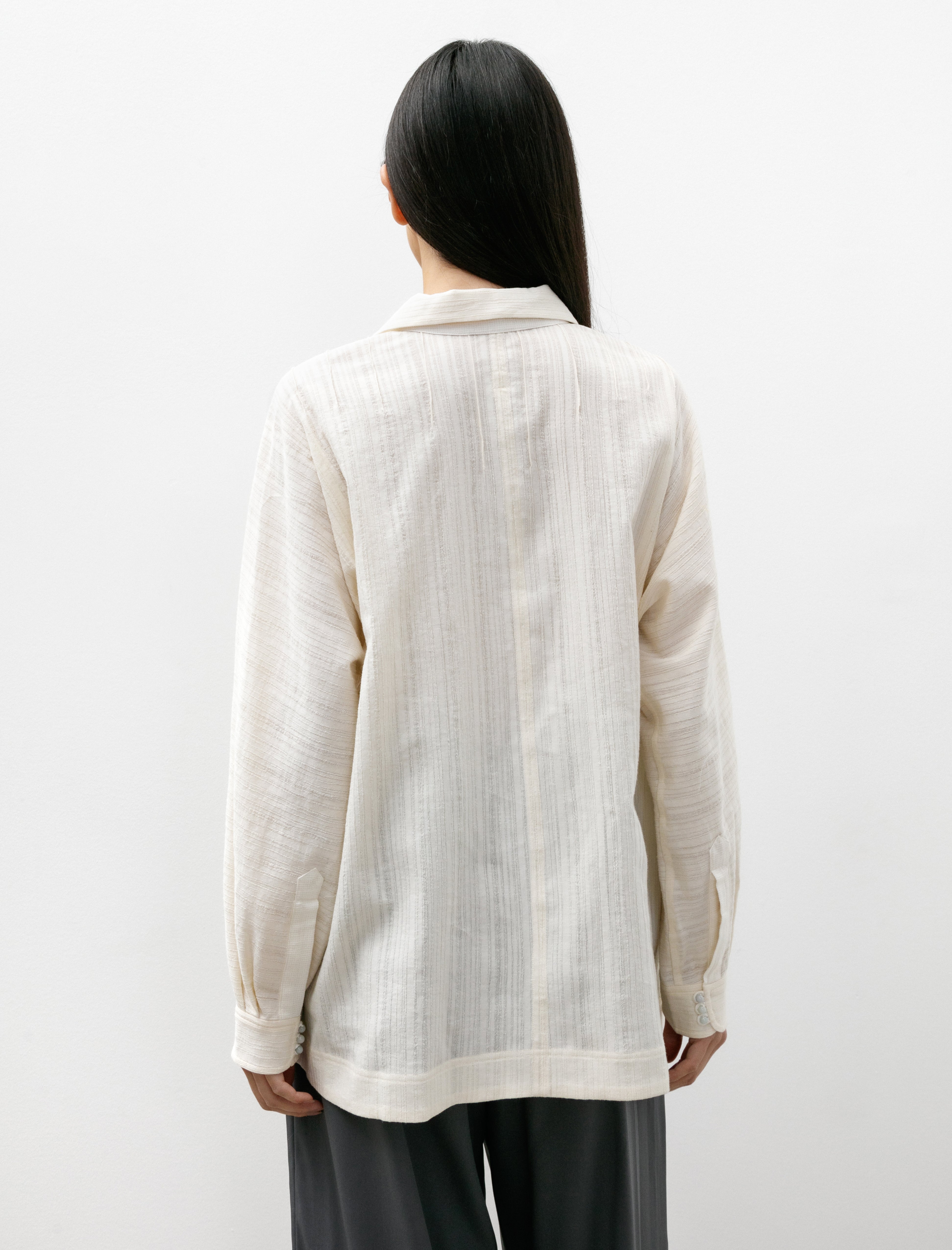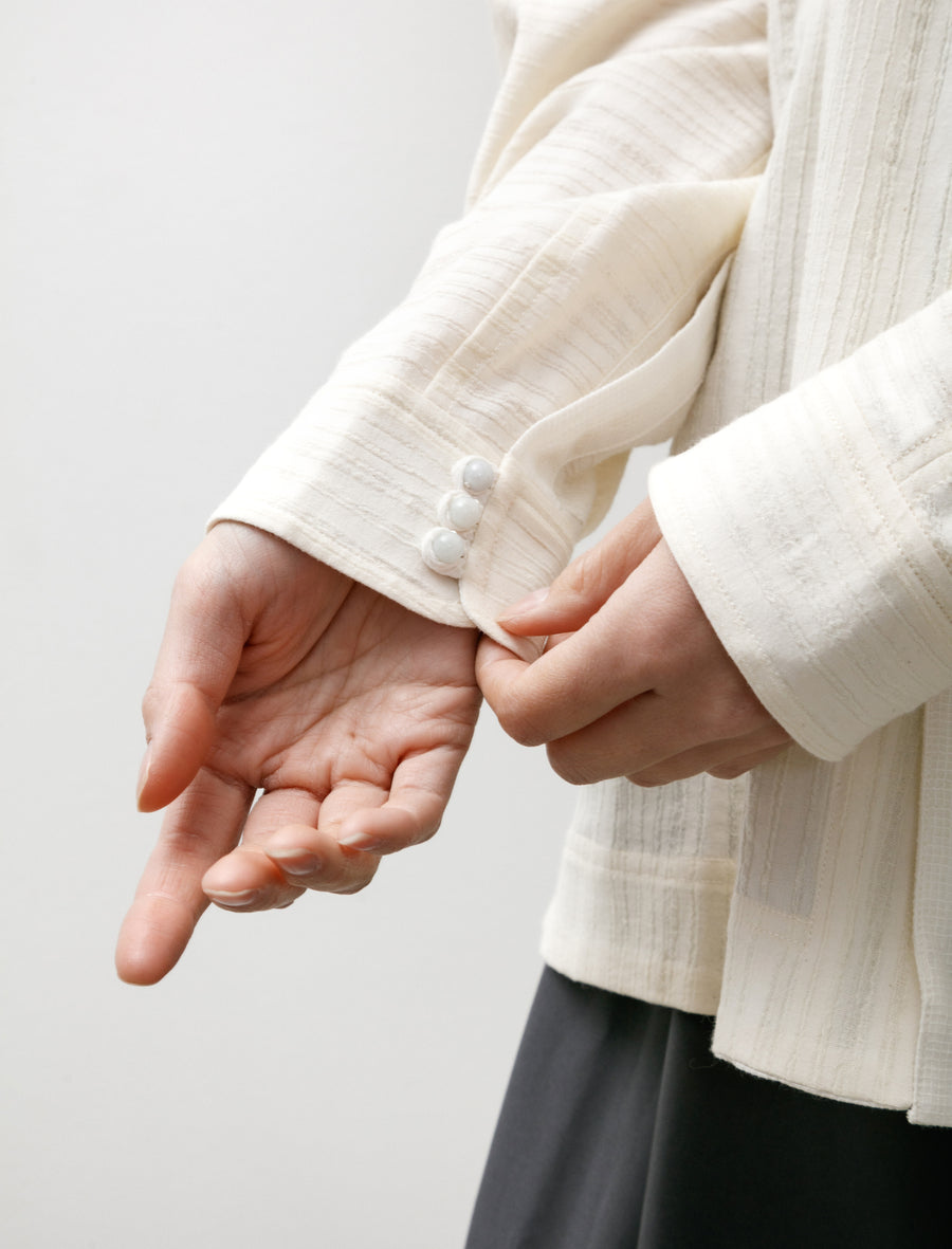 Thoughtful yet effortless, this button-up shirt from seventyfive is sure to hold a forever place in any wardrobe. Made of an airy blend of cotton, linen, and ramie, it is incredibly lightweight and breathable with a subtly sheer appearance. The main fabric has a textured pattern of vertical lines, while a grid-textured fabric contrasts at one of the front pockets, the button front placket, the cuffs, and under the collar for added charm. The classic collar can turn into a stand collar with the simple fastening of a jade button at the neck for added versatility. Complete with side slits at the hem, raised darting details at the back, and stunning jade buttons at the cuffs, this shirt is the perfect balance of simple and unique.