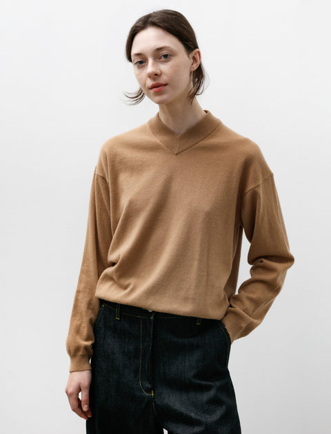 Simplicity at its finest: a roomy, slightly cropped v-neck sweater knit from a plush lambswool yarn that is surprisingly warm. Dropped shoulders shift volume to the sides and sleeves, expressing the soft drape of the wool while also creating an inner cocoon that is ideally suited to winter layering. Rib knit detailing at the cuffs, hem, and neckline complete the timeless minimal look while controlling the generous ease with a gentle hand.