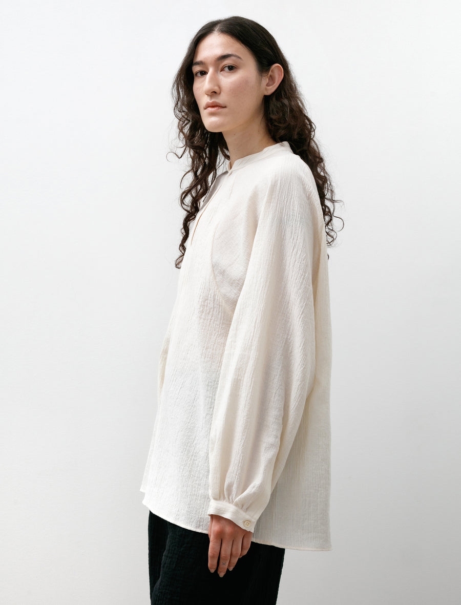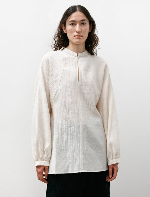 Simple yet far from boring, this elegant top is perfect for adding an elevated touch to everyday dressing. Made from a matelassé fabric in a neutral milk colour, it is incredibly lightweight with a unique crinkled texture and a beautiful drape. The silhouette is roomy with voluminous raglan sleeves to complement the airy feel. Complete with a stand collar with a buttoned keyhole opening and buttoned cuffs, this top can take you from a casual afternoon to a day at the office and everything in between.