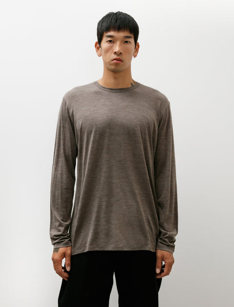 Veilance's signature relaxed fitting, long sleeve t-shirt cut from a soft, lightweight merino/nylon jersey in an olive brown heather. Ergonomic panelling and a yoked back offer a highly accommodating fit that minimizes abrasive surfaces by shifting seams away from regions of frequent wear. Completed with a double-needle bound neckline.
